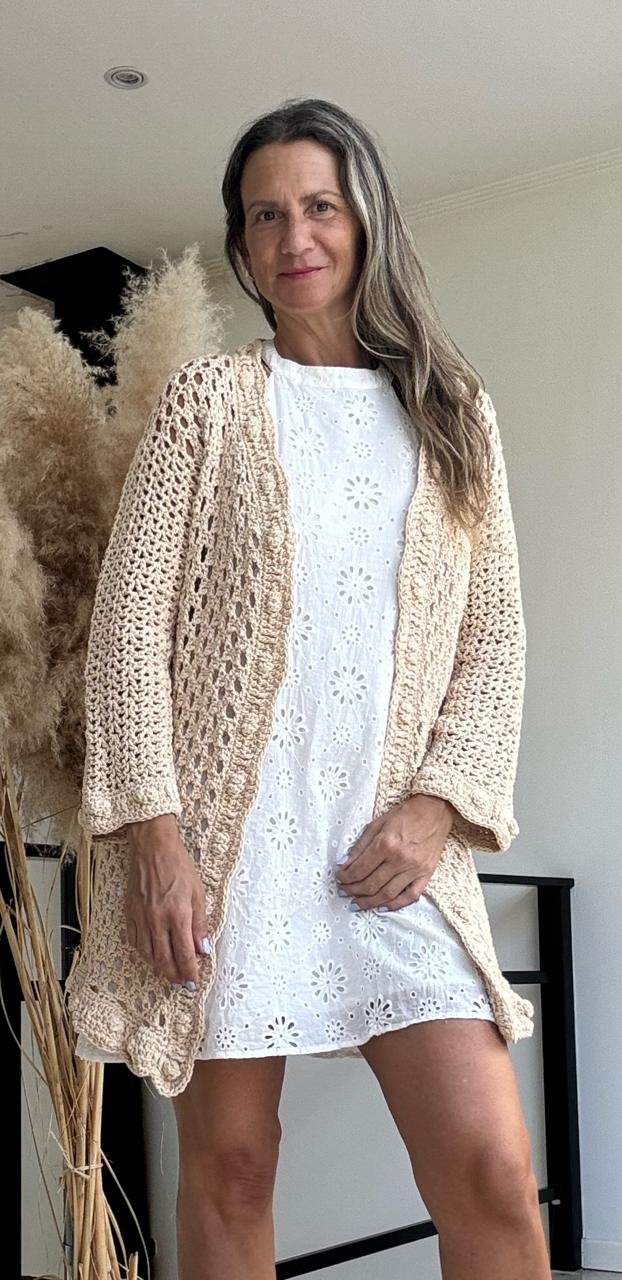 - Este que ves en la foto está tejido con hilo de algodón Carena (8/8) y aguja n°5. Me llevo 650 grs y yo soy un talle M/L